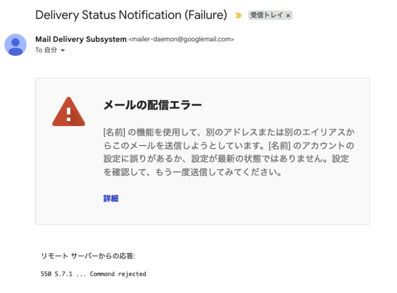 意図的に Gmail の From を名前で設定済の “他のメールアドレス” に切り替えて送信すると、数秒後に上図の内容を受信する。